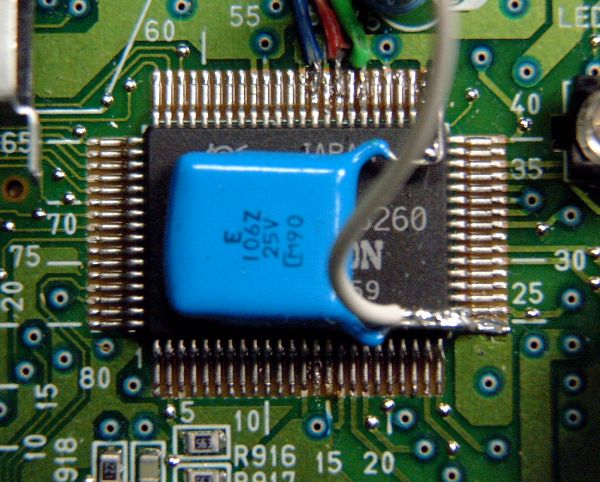 かなり乱暴な追加のしかただが、うまくいっているのでよしとする。 手に入ったのが耐圧25Vのだったのでえらくでかいが、耐圧が低ければ もっと小型のがあるだろう。