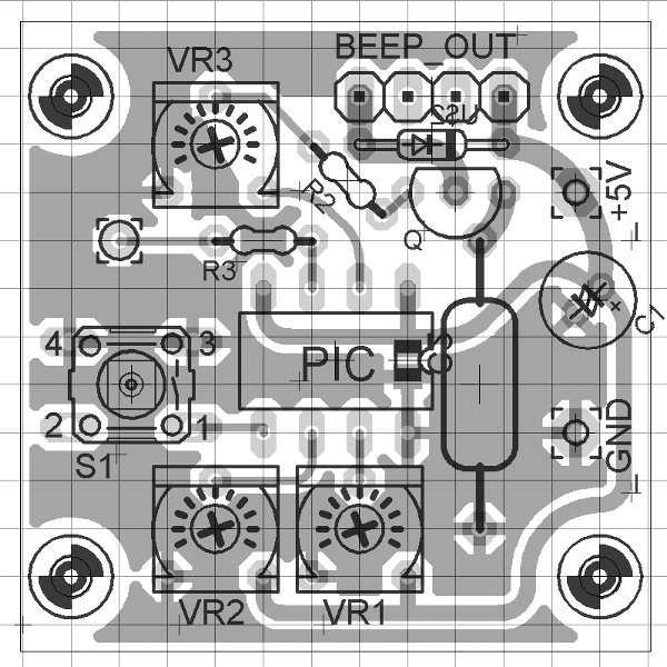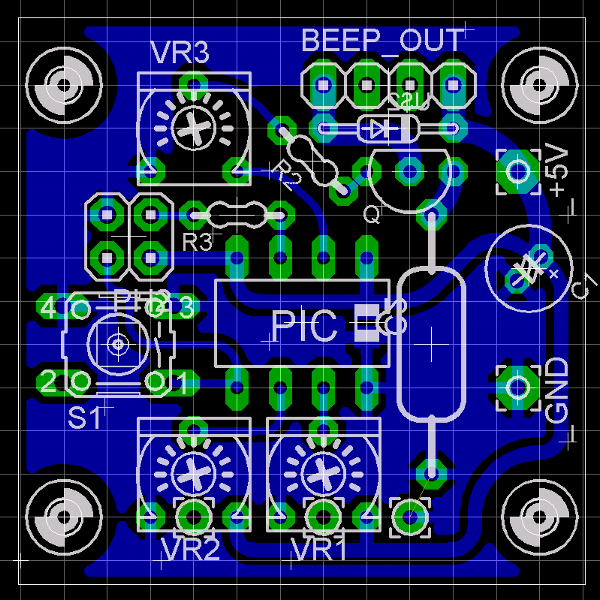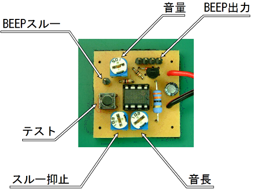 電源ON時の+5V立ち上がりと共に動作開始。2kHz(ピ)と1kHz(ポ)の矩形波を発生します。発音前に長さ設定用VRによる電圧を10bitでA/D変換し、その値を発音する長さとします。